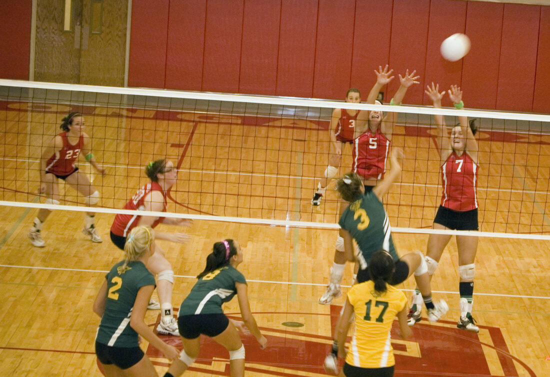 - Tonganoxie High’s Molly O’ Hagan and Megan Puhr rise for a block as teammates Chrissie Jeannin and Maggie Franuik look on.