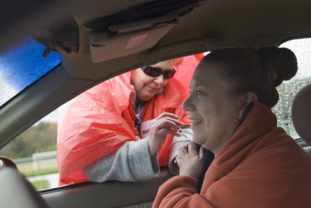 Deborah Whitney, of St. John’s Hospital, gives Cathy Adams, Leavenworth, a flu vaccination during an October 2008 drive-through flu shot clinic in Leavenworth.