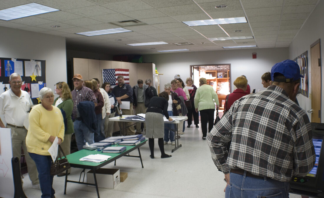 A line starts to form at the Tonganoxie Public Library as Leavenworth County residents prepare to cast their advance ballots in the 2008 general election early. More than 2,870 people have taken advantage of advance voting. The satellite polling station will be open between 1-7 p.m. Oct. 29 at the Basehor Community Library, 1400 158th St..