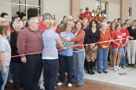 - Pam Jeannin, with help from fellow Tonganoxie residents, cuts the ribbon at a dedication ceremony Thursday at the Chieftain Remembrance Walk outside Tonganoxie High School. Left of Jeannin, also in light blue, is Kelly Frantz, who is Jeannin’s daughter. Frantz’s husband, Cpl. Lucas Frantz, was killed in 2005 while serving in Iraq. The courtyard grew from an idea to honor Frantz and will recognize living and deceased members of the community for years to come.
