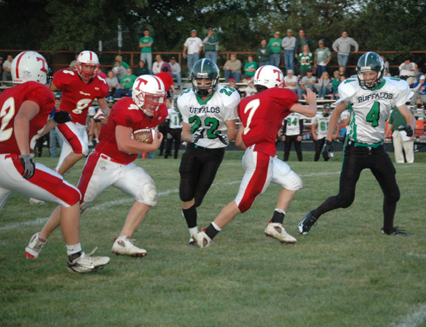 Tonganoxie High quarterback Zack Robinson cuts upfield against the Prairie View defense on Friday at Beatty Field. Robinson led the Chieftains' rushing attack with 85 yards on 15 carries in Tonganoxie's 14-7 victory over the Buffalos.