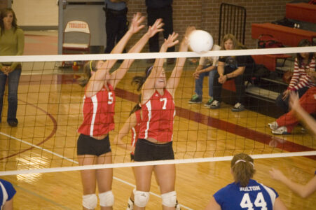 - Molly O’Hagan and Megan Puhr go up for a block against Holton on Tuesday, Sept. 9 at Tonganoxie High. The Chieftains won that dual and another the following night at Baldwin.