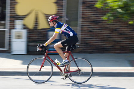 A rider on the annual Buffalo Bill Century bike tour passes through downtown Tonganoxie last year.