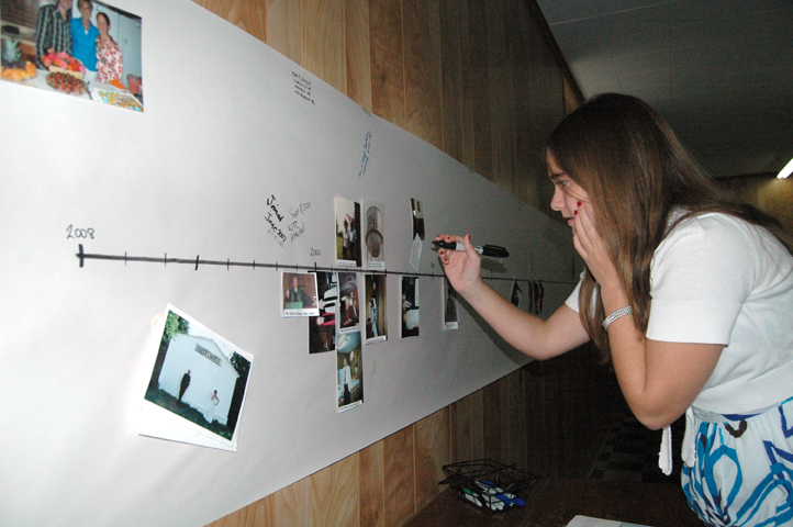 Kate Ebbert denotes an event Sunday on the timeline posted on a wall in the First Congregational Church basement in Tonganoxie. The church celebrated its 140th year in Tonganoxie. Kate and her twin sister, Megan, also were confirmed Sunday.