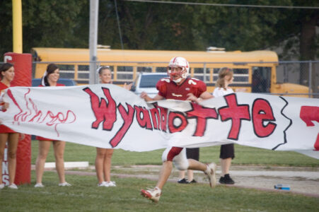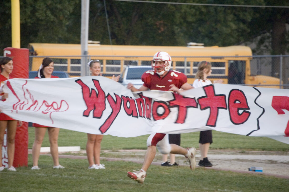 - Tonganoxie High senior lineman Jamie Everett runs through the “Whoop Wyandotte” sign before the Chieftains’ game on Friday night at Beatty Field. THS did just that, defeating WHS, 34-8.