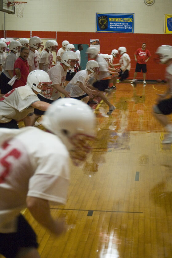 - The Tonganoxie High football team runs sprints in the west gym Monday morning. Weather forced the team inside for the first day of practice.