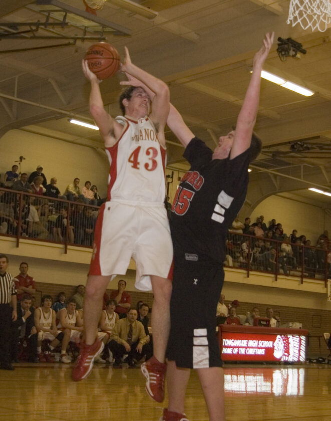 - Austin Smith draws contact from 6-foot-10 Thomas Richmond during Tonganoxie High’s 54-43 victory over Bishop Ward on Friday night. Smith and Richmond mixed it up inside throughout the game and Smith finished with 11 points, eight rebounds and two blocked shots.