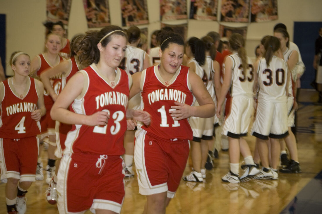 - Tonganoxie High seniors Chrissie Jeannin and Roni Grizzle run off the floor following the Chieftains’ narrow defeat of Bishop Ward at Kansas City, Kan., on Friday night. The two seniors combined for 33 points in the 48-46 THS victory.