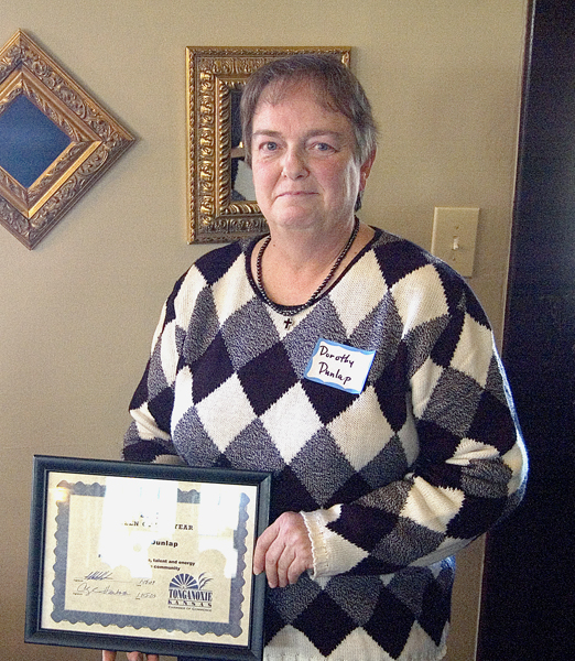 At the chamber’s annual meeting Thursday at the Amanna élan bed and breakfast, the chamber of commerce recognized Dunlap for her years of community service in Tonganoxie.