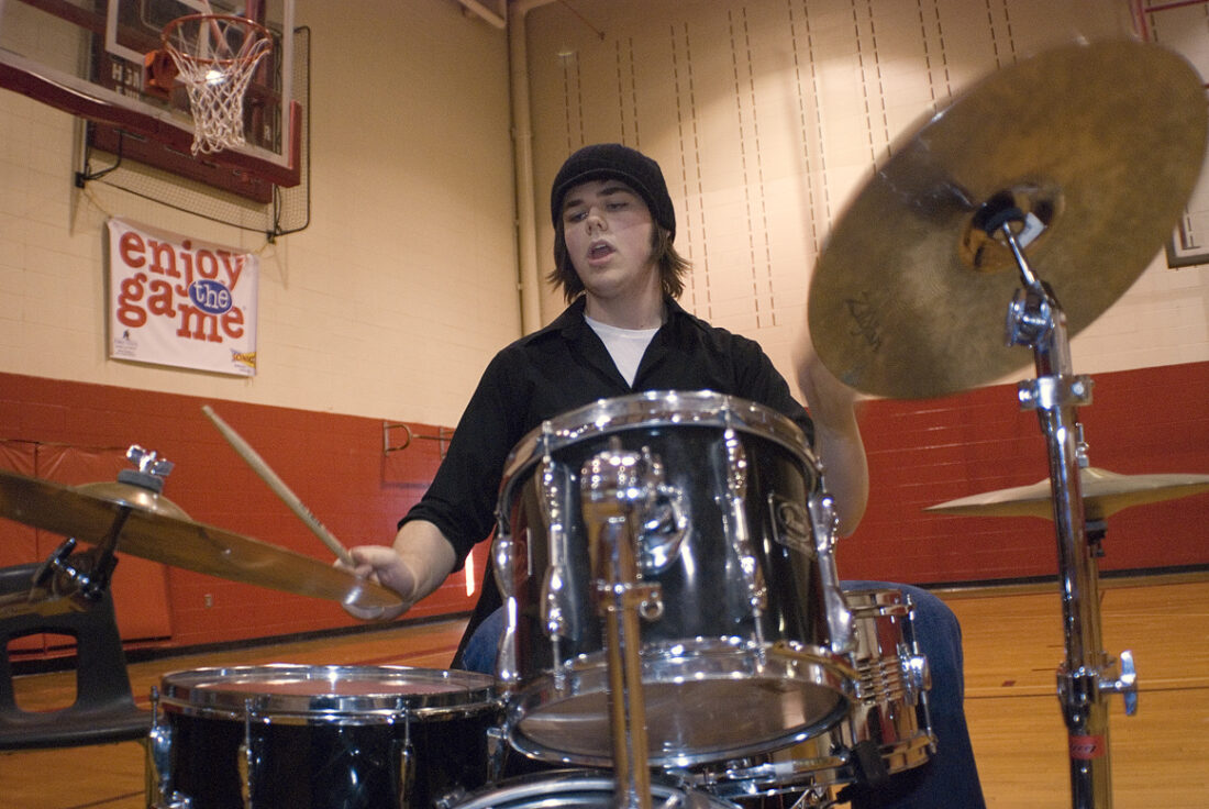 - Rex Hancock plays on his drum set after an awards assembly Friday. Hancock was recently awarded first chair in percussion for the 1A-6A State Orchestra.