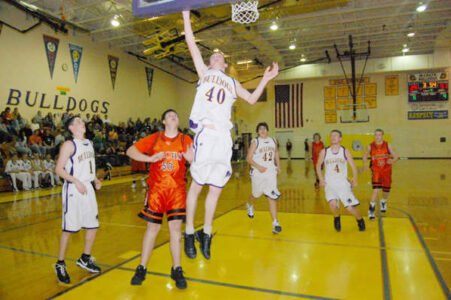 - Gavin Swearngin goes up for a lay-in against Atchison County on Friday night at McLouth High. A freshman, Swearngin has been playing better of late and helped the Bulldogs pick up their first victory of the season this past week at the McLouth Tournament. MHS finished fourth at the tourney.