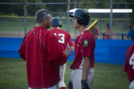 - Post 41 coach Gary Wagner talks with Kyle Newton in the middle of the fourth inning on Tuesday night at Leavenworth. Newton went 5-for-5 in Tonganoxie’s 9-8 defeat of Easton in the Post 23 League championship game.