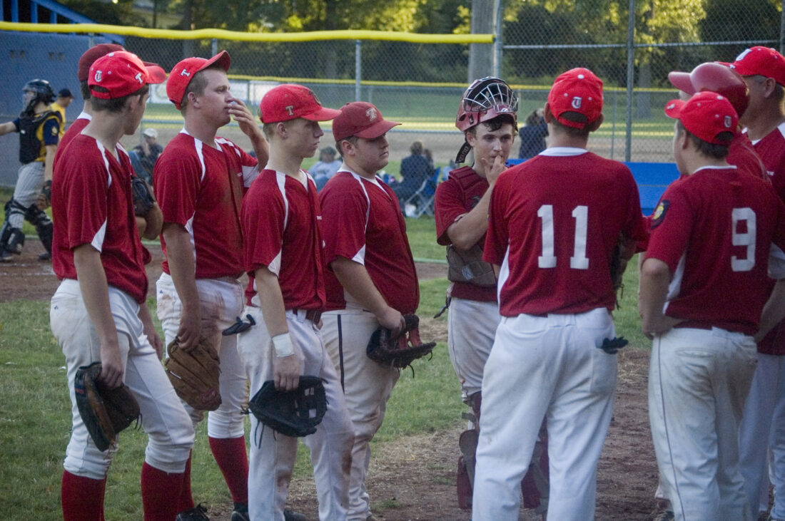 Trailing by three in the third inning, Tonganoxie players listen to caoch Gary Wagner before rallying for a 9-8 victory against the Easton Outlaws on Tuesday at Leavenworth.