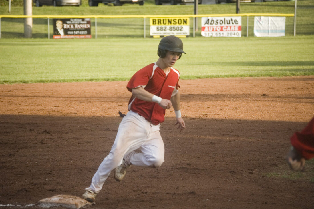 - Brett Bailes rounds third on his way to scoring Tonganoxie’s first run in a 9-8 victory over Easton in the league championship game on Tuesday at Leavenworth.