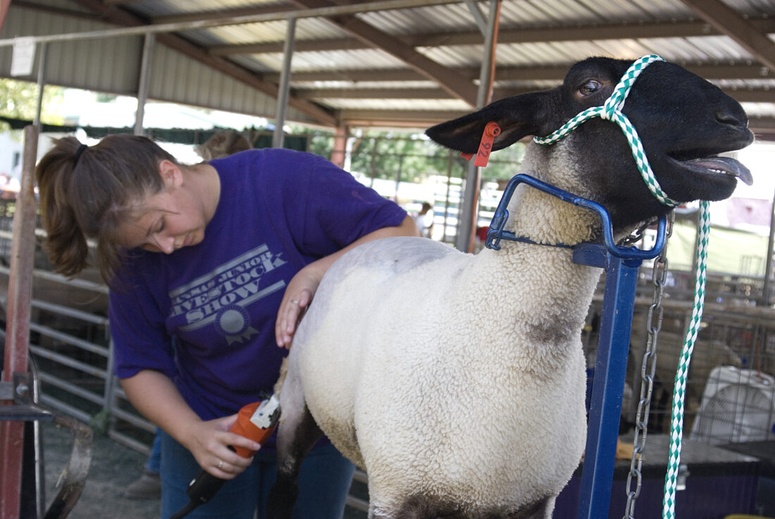 - Lindsey Gonser shears a sheep for showing Tuesday at the 2008 Leavenworth County Fair.