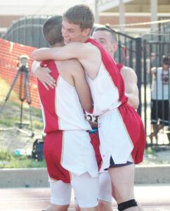 - David Powell hugs DJ Lindsay moments after Tonganoxie won the state championship in the 4×400 relay race on Saturday in Wichita.