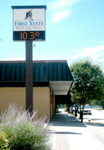 - The electronic sign at the First State Bank & Trust, 400 Bury St., shows an air temperature of 103 degrees Fahrenheit on July 21, 2008.