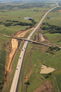 This aerial photo looks east along the Kansas Turnpike at a new interchange being built at Leavenworth County Road 1, the road that crosses the turnpike using a new bridge about eight miles east of Lawrence.