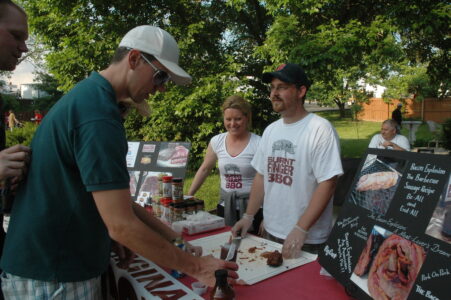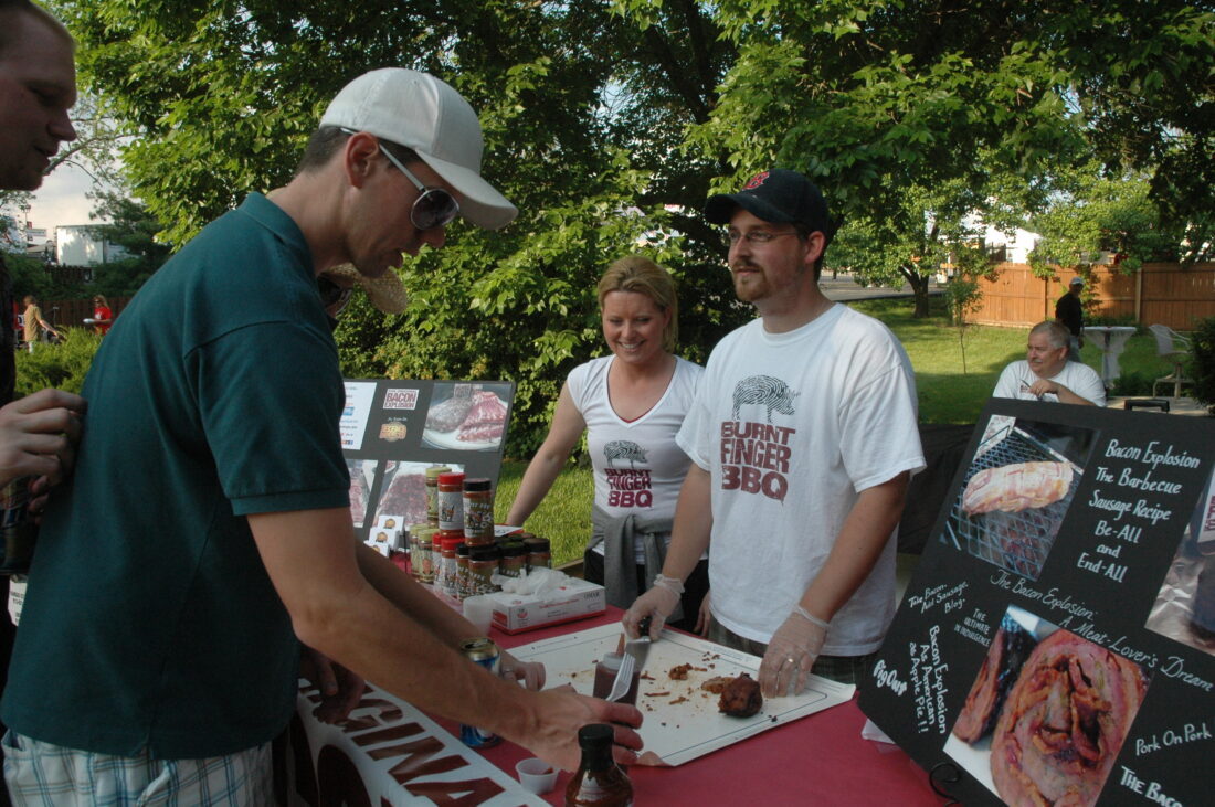The Bacon Explosion had its first product launch, where Day and his wife Megan offered free samples, at Friday night’s featured Barbecue Festival event, the BBQ Blues Party. The event appropriately kicked off the weekend of barbecue contests, food, carnival rides and music with food catered by Oklahoma Joe’s Barbecue, blues music and, of course, a sampling of Day and Chronister’s creation.