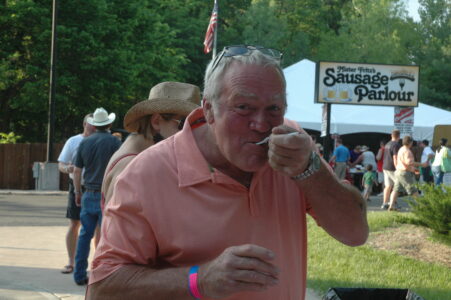 - Mike Horsch, of Lee’s Summit, Mo., enjoys a sample of the Bacon Explosion.