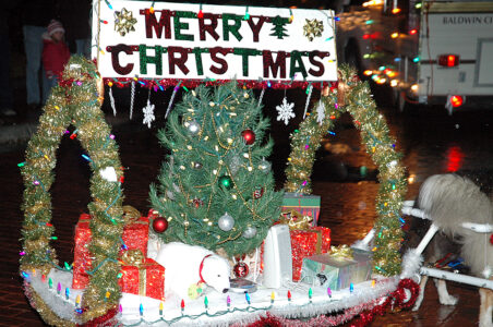 - Baldwin City will kick off the season with its 10th annual Holiday Light Parade at 6 p.m. Saturday downtown. Here a Christmas sign was being pulled by two dogs in last year’s parade.