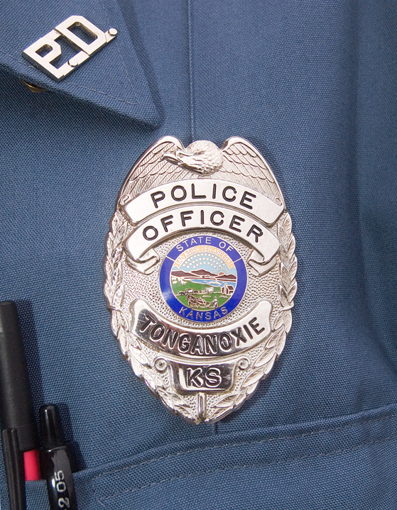 Jake wears the new badge on his uniform. His father’s badge rests in a shadow box with his father’s nametag and Tonganoxie police badge.