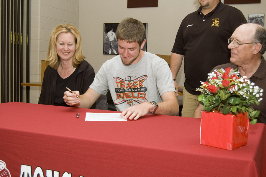 - Stephen Wilson signs his letter of intent to throw for the track team at Johnson County Community College as his parents, Betty and Larry, watch. Wilson threw the discus his senior year at Tonganoxie High.
