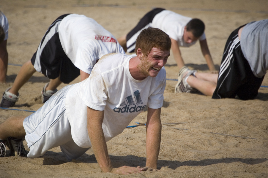 - With sand caked on his face, Zach Tallent fights through the pain of holding a diamond push-up at Tonganoxie High boys soccer practice on Monday. Push-ups were just part of a grueling core workout the soccer players went through in the sand of the volleyball courts at Chieftain Park.