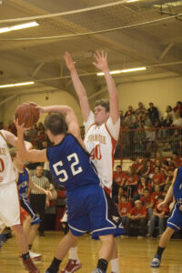 - Tonganoxie High senior forward Justin Jacobs forces a pass outside in the first half of the Chieftains’ 53-22 defeat of Perry-Lecompton on Friday. The THS defense held the Kaws to 9-of-47 shooting.