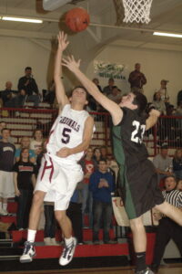 - Eudora High’s Conner Scott (5) drives in for a layup as De Soto’s Kyle McCulloch (23) defends during the second quarter Saturday at Tonganoxie. Eudora won the third-place game 35-31.