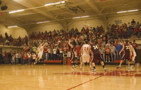 Tonganoxie High junior guard Jeremy Carlisle heaves a desperation three-pointer as time expires in the Chieftains' 46-43 overtime loss to Silver Lake in the Tonganoxie Invitational title game on Saturday night.