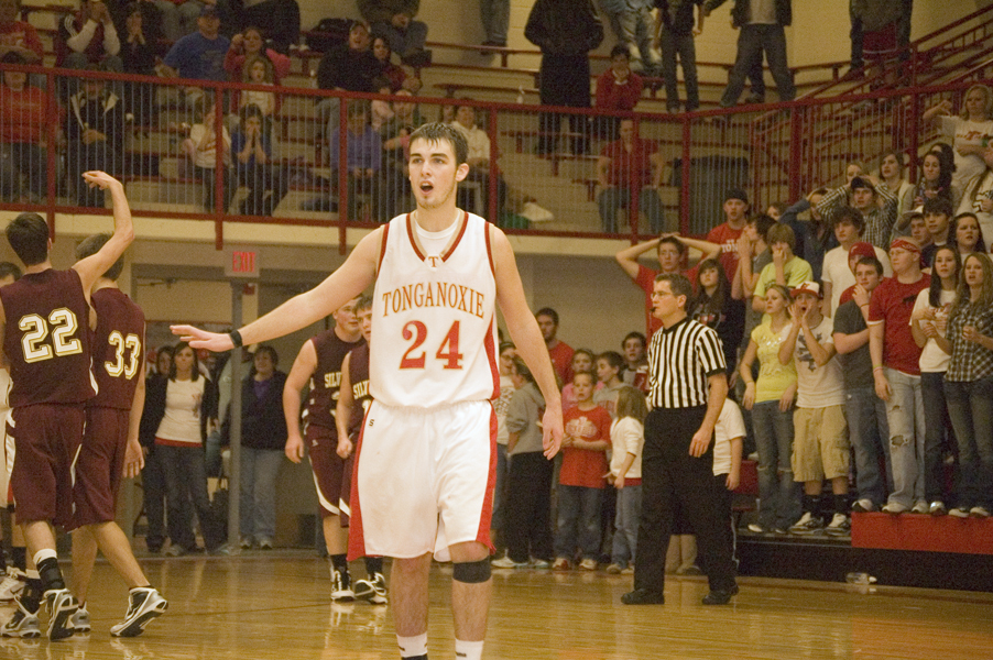 First Keenan Kruger hit one of two with 1.9 seconds to go to put SLHS up, 44-43, then THS senior forward Justin Jacobs was called for a foul while going for the ball on Tonganoxie’s ensuing in-bound play and SLHS junior Casey Smith hit both of his attempts with 1.3 seconds remaining.