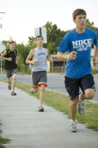 - Tonganoxie High cross country runners, from left to right, Andrew Behm, Mitch Brock and Brad Andrews make their way south on Pleasant Street during a warm-up run on Aug. 2. The Chieftains, for five weeks, had summer workouts twice weekly at 8 p.m. to beat the high summer temperatures.
