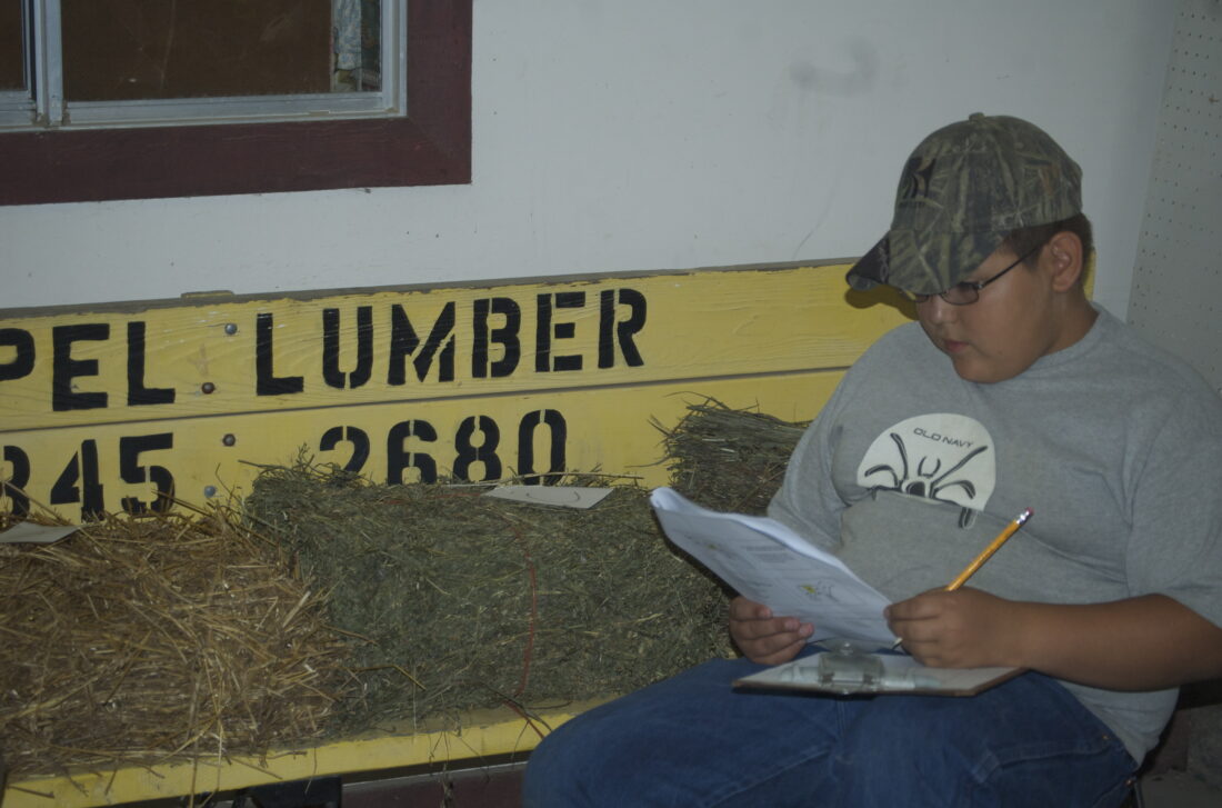 - D.J. Klamm, who lives near Bonner Springs, works his way through his Ag Challenge of Champions test at about 12:30 p.m. Friday at the 4-H office at the Leavenworth County Fair. D.J. said the toughest question he’d faced yet was one asking him to identify a weed flower from a photo. The hay bales behind D.J. were part of the test, as well; competitors had to identify them as alfalfa, brome or straw.