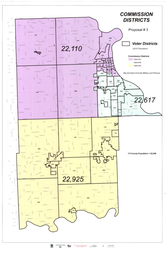 - Leavenworth County staff’s Proposal 3 for county commission redistricting, County Clerk Janet Klasinski said, would be the most radical change of any of the proposals. It would split most of the county’s unincorporated areas between districts 1 and 3, leaving Lansing, Delaware Township and much of Leavenworth in District 2. Population figures are based on the 2010 Census.