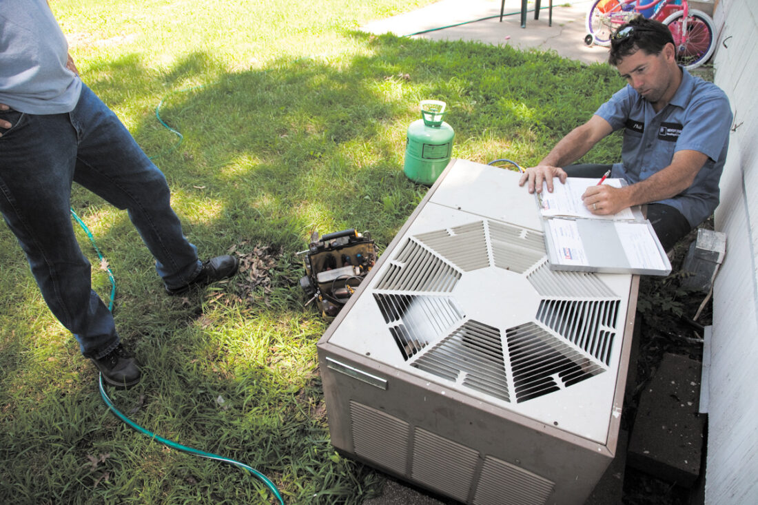 Air conditioning technician Phil Foster fills out paperwork after servicing a unit. Bruce Snead, a K-State Research and Extension residential energy specialist, answers questions about how to help keep the lid on cooling costs.