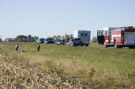 Leavenworth County Sheriff's officials work the scene of a motorcycle accident that occurred about 10 a.m. Thursday, Oct. 13, 2011, about a mile south of Tonganoxie on U.S. Highway 24-40. The bike's driver, Eldon Barrett of Parker, was taken to Kansas University Hospital by Leavenworth County Emergency Medical Services after the wreck. Barrett lost control of the bike and hit the ditch, which caused the bike to travel about 20 yards before coming to rest, according to two others who were riding with him.