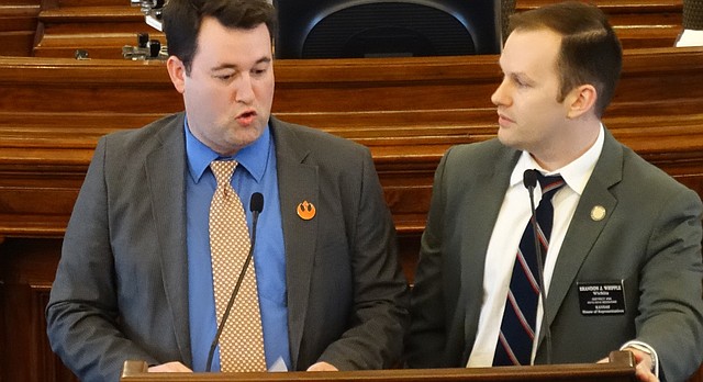 Rep. Brett Hildabrand, left, R-Shawnee, answers questions from Rep. Brandon Whipple, D-Wichita, about a resolution calling for a constitutional convention of the states to rein in the power of the federal government.