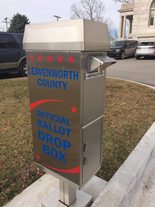 A ballot drop-off box stands near the Leavenworth County Courthouse on the south side. A similar box is at the Leavenworth County Annex in Tonganoxie. Tonganoxie voters can drop off their ballots at the annex, which County Clerk Janet Klasinski said actually would save the city of Tonganoxie on postal charges. Ballots are due back to the county at noon Feb. 28.
