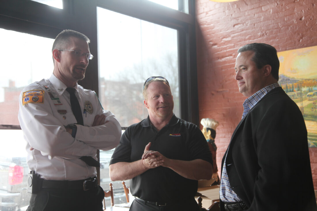 Leavenworth County EMT Director Jamie Miller, left, talks to local Realtors Dan Lynch, middle, and Mike Reilly, right. Lynch and Reilly gave donations to help make Leavenworth County first responders' families eligible for beneifts if they die in the line of duty.