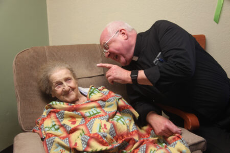 The Rev. Mark Goldasich shares a laugh with his mother, Angeline Goldasich, on Monday at Legend Healthcare in Tonganoxie. Angeline, who is a resident at Legend, turns 101 on Friday.