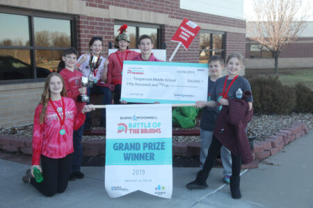 - Tonganoxie Middle School students show off their swag after winning this year’s Burns & McDonnell Battle of the Brains on Wednesday at Union Station. TMS’ “Step Right Up” proposal won a $50,000 grant for the school’s science, technology, engineering and math department. The students also will work with engineers to create a $1 million version of their exhibit at Science City.