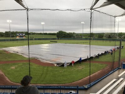 With the game still scoreless and the Chieftains batting in the top of the second, umpires cleared the field due to a lighting delay. Minutes later, a downpour dropped heavy rain on the ballpark and the tarp came out to cover the infield.