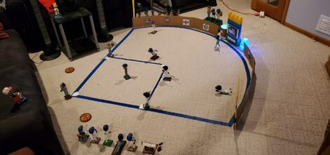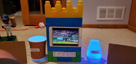 Some of Evelyn’s Lego Duplos building blocks were used to construct the “giant” scoreboard beyond center field.