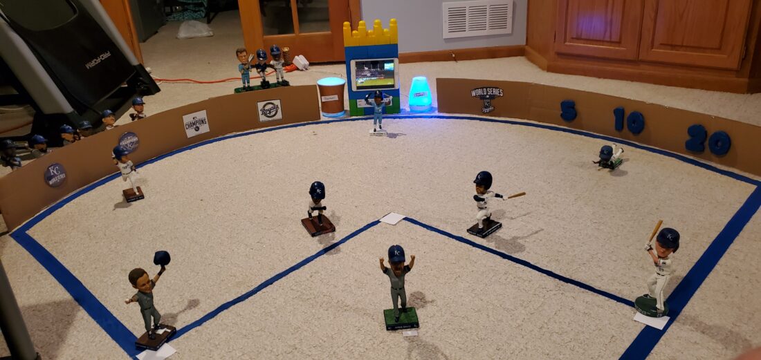 Some repurposed cardboard became the outfield wall, commemorative buttons served as outfield wall logos and some of Evelyn’s bath toys — blue numbers — symbolized the Royals’ various retired numbers. There was a 5 (George Brett), 10 (Dick Howser) and 20 (Frank White).
