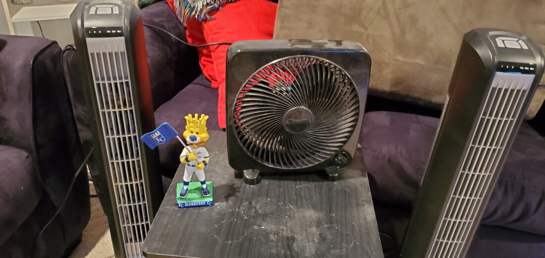 Sluggerrr, meanwhile hung out in the upper deck couch with the fans, which were, well, fans — a couple oscillating tower fans and a desk fan.