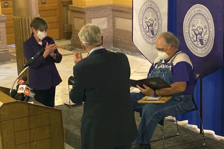 Kansas Gov. Laura Kelly and Kansas State University President Richard Myers awarded the bachelor’s degree Tuesday to Dennis Ruhnke, of Troy, Kan. Ruhnke was just two credits away from earning his degree in 1971 when he left school after the death of his father so he could help take care of his mother and the family farm.