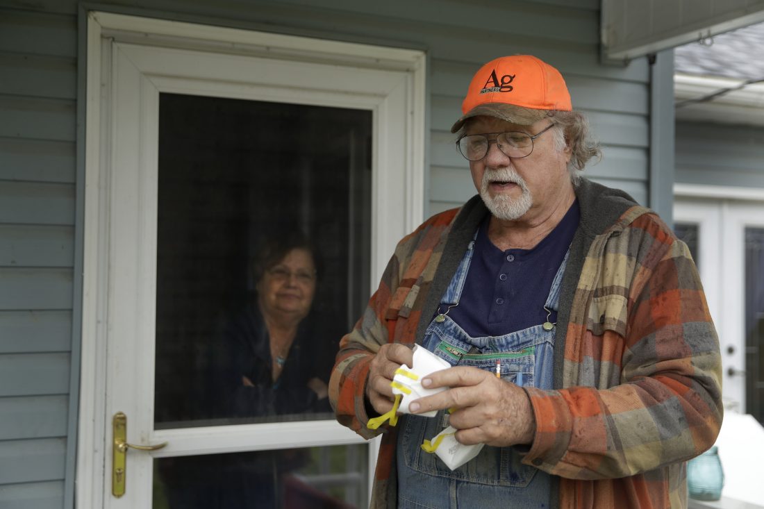 Dennis Ruhnke holds two of his remaining N-95 masks as he stands with his wife, Sharon at their home near Troy Friday, April 24, 2020. Dennis, a retired farmer, shipped one of the couple’s five masks left over from his farming days to New York Gov. Andrew Cuomo for use by a doctor or a nurse. (AP Photo/Charlie Riedel)