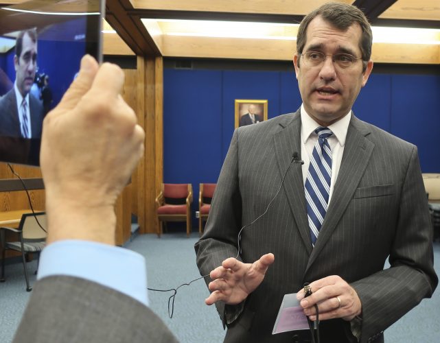In this AP file photo from May 9, 2019, Kansas Attorney General Derek Schmidt speaks with reporters following a Kansas Supreme Court hearing in Topeka. (AP Photo/John Hanna)