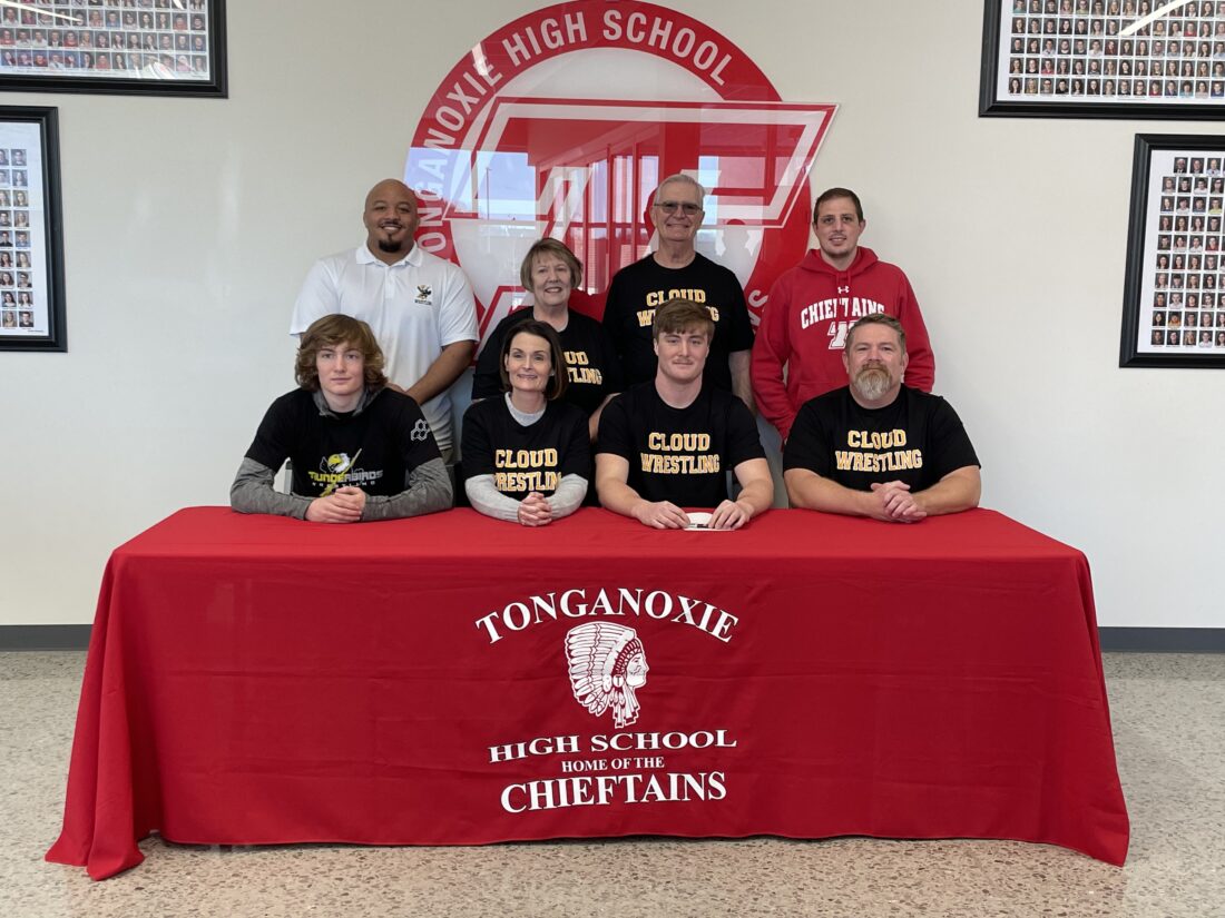 - Tonganoxie High senior Gabe Bailey signs a National Letter of Intent on Thursday to wrestle at Cloud County Community College in Concordia. Gabe, seated second from right, is flanked by family members, as well as Cloud coach Julian Smith, top left, and THS coach Brett Delich, top right.